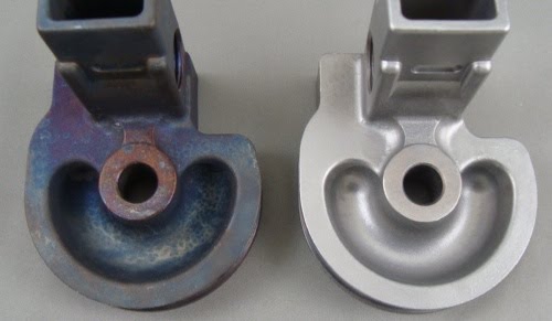 The stainless steel parts pictured above (before on left) are about 3″ in size and weigh less than 2 pounds each. The parts were tumble blasted for less than 10 minutes with Coarse (#6) Glass Bead to remove the heat treat discoloration and achieve the finished surface on the right. The geometry of these parts are ideally suited for this process since they will tumble over each in 3 dimensions allowing all areas of the part to be exposed to the blast stream.
